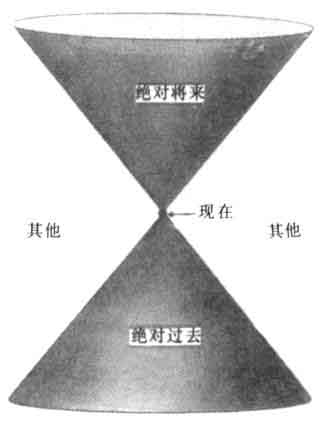 一個事件P的過去和將來光錐將空間——時間分成三個區域(圖2.5):這事件的絕對將來是P的將來光錐的內部區域,這是所有可能被發生在P的事件影響的事件的集合。從P出發的信號不能傳到P光錐之外的事件去,因為沒有東西比光走得更快,所以它們不會被P發生的事情所影響。過去光錐內部區域的點是P的絕對過去,它是所有這樣的事件的集合,從該事件發出的以等於或低於光速的速度傳播的信號可到達P。所以,這是可能影響事件P的所有事件的集合。如果人們知道過去某一特定時刻在事件P的過去光錐內發生的一切,即能預言在P將會發生什麼。空間——時間的其餘部分即是除P的將來和過去光錐之外的所有事件的集合。這一部分的事件既不受P的影響,也不能影響P。例如,假定太陽就在此刻停止發光,它不會對此刻的地球發生影響,因為地球的此刻是在太陽熄滅這一事件的光錐之外(圖2.6)。我們只能在8分鐘之後才知道這一事件,這是光從太陽到達我們所花的時間。只有到那時候,地球上的事件才在太陽熄滅這一事件的將來光錐之內。同理,我們也不知道這一時刻發生在宇宙中更遠地方的事:我們看到的從很遠星系來的光是在幾百萬年之前發出的,在我們看到的最遠的物體的情況下,光是在80億年前發出的。這樣當我們看宇宙時,我們是在看它的過去。