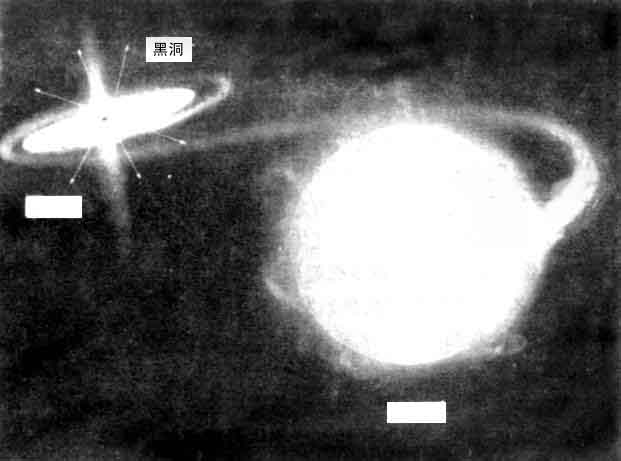 按照黑洞定義,它不能發出光,我們何以希望能檢測到它呢?這有點像在煤庫裡找黑貓。慶幸的是,有一種辦法。正如約翰·米歇爾在他1783年的先驅性論文中指出的,黑洞仍然將它的引力作用到它周圍的物體上。天文學家觀測了許多系統,在這些系統中,兩顆恆星由於相互之間的引力吸引而互相圍繞著運動。他們還看到了,其中只有一顆可見的恆星繞著另一顆看不見的伴星運動的系統。人們當然不能立即得出結論說,這伴星即為黑洞——它可能僅僅是一顆太暗以至於看不見的恆星而已。然而,有些這種系統,例如叫做天鵝X-1(圖6.2)的,也剛好是一個強的X 射線源。對這現象的最好解釋是,物質從可見星的表面被吹起來,當它落向不可見的伴星之時,發展成螺旋狀的軌道(這和水從浴缸流出很相似),並且變得非常熱而發出X射線(圖6.3)。為了使這機制起作用,不可見物體必須非常小,像白矮星、中子星或黑洞那樣。從觀察那顆可見星的軌道,人們可推算出不可見物體的最小的可能質量。在天鵝X-1的情形,不可見星大約是太陽質量的6倍。按照強德拉塞卡的結果,它的質量太大了,既不可能是白矮星,也不可能是中子星。所以看來它只能是一個黑洞。