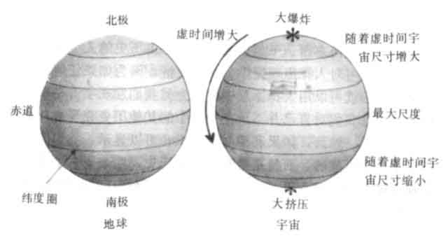 人們從無邊界假定得知,宇宙沿著大多數歷史的機會是可以忽略不計的,但是有一族特別的歷史比其他的歷史有更多機會。這些歷史可以描繪得像是地球的表面。在那兒與北極的距離代表虛的時間,並且離北極等距離的圓周長代表宇宙的空間尺度。宇宙是從作為單獨一點的北極開始的。當你一直往南走去,離開北極等距離的緯度圈變大,這是和宇宙隨虛時間的膨脹相對應(圖8.1)。宇宙在赤道處達到最大的尺度,並且隨著虛時間的繼續增加而收縮,最後在南極收縮成一點。儘管宇宙在北南二極的尺度為零,這些點不是奇點,並不比地球上的北南二極更奇異。科學定律在這兒有效,正如同它仍在地球上的北南二極有效一樣。