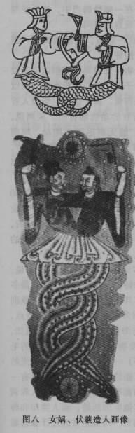 在20世紀,人們在漢代古墓中,發現了一幅很奇特的關於女媧造人內容的繪畫,畫中的女媧與伏羲都是人面蛇身,兩尾相環,左右相交,下有一個小孩,雙手牽著女媧伏羲的衣帶,這是女媧伏羲造人的圖畫表示。但奇怪的是,伏羲手拿一個曲尺,女媧手持一個圓規。大家知道,曲尺和圓規都是計算用具,本身與神話的內容毫不相干,與其他神話內容也不相容。漢代的人想用這幅圖畫表示什麼呢?我們可以這樣來推測:這幅圖畫表示的內容本是女媧伏羲神話中的東西,在漢代時還有相當的流傳,但是現在的神話文獻中卻看不到了,它肯定是神話丟失的內容,這些內容也一定與曲尺和圓規有關。那麼神話的本來面目又是什麼呢?我們認為,圓規和曲尺在這裡表示的東西,用現在的話來講,就是科技和知識,只是在漢代人們無法表達傳說裡的高深技術,只好用當時最先進的曲尺和圓規來表達。這幾乎是唯一的解釋(見圖八)。