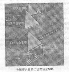 薩吉高地最北邊是世界上最大也是最古老的胡夫金字塔,其東南面是著名的「獅身人面像」斯芬克斯。最南邊為胡夫孫子門卡拉金字塔。門卡拉金字塔東面側有三座小金字塔,其中一座為角錐形的金字塔,其外觀早巳被歲月的風雨侵蝕得殘破不堪,這就是1999年3月3日將被開啟的卡蒙若內比梯二世王后的金字塔。與其夫的金字塔相比,這座金字塔的高不及其一半。