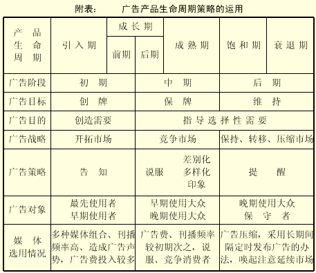 任何一種產品通常都有生命週期,只是週期長短不同。產品處在不同的生命發展階段,其工藝成熟程度、消費者的心理需求、市場競爭狀況和市場營銷策略等,都有不同的特點。因此,廣告目標、訴求重點、媒介選擇和廣告實施策略也有所不同。