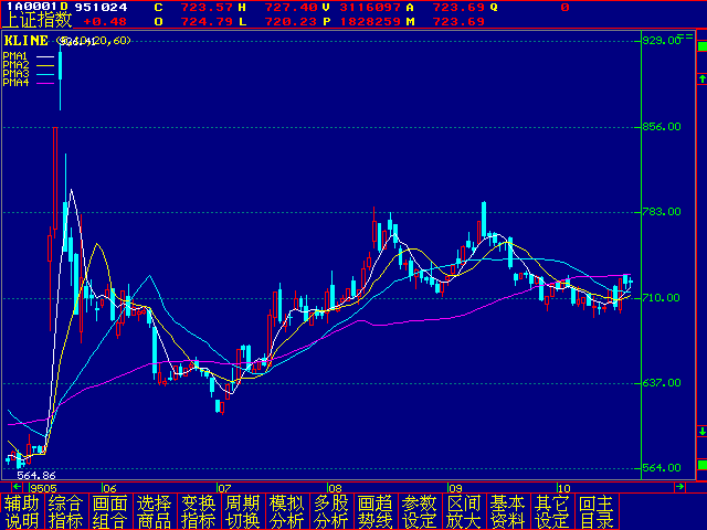 「95.7」,滬市股指從524衝至723點,「95.7.19-95.8.9」在700點區域蟄伏16個交易日,多方主力不甘心這一局面,恰巧「北旅」的外資控股題材登場,「95.8.9」後市其開盤5分鐘,就在均價以上成交了600萬股(理論上4000多萬股的流通股,只要開盤後5分鐘能成交300萬股,就會有不小的行情),被主力借題發揮,扮演了救世主的角色,並成功帶動其低價關聯板塊,產生一波700—794的再旗桿行情。(見圖表12、圖表13)