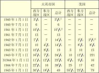 1「英軍」和「美軍」這兩個詞,包括他們作戰時指揮的盟國部隊在內。表中有零頭數字的,是由英軍、美軍共同「擊毀」的。共同「擊毀」的事例很多,但在擊毀的德國潛艇總數里,把零數加成為整數。
