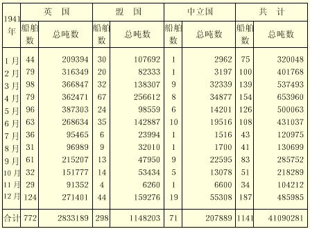 被敵人擊沉的英國、盟國和中立國的商船和漁船每月數字統計表