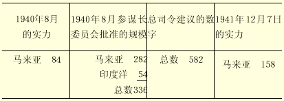 三軍參謀長更進一步建議,當英國皇家空軍已經達到他們所提出的數字時(三百三十六架),最低限度的守備人員應有六個旅(十八個營),並有輔助部隊。1941年1月,根據馬來亞駐軍總指揮官的建議,三軍參謀長又把守備人員的數字提高到二十六個營。但是在空軍能夠充分擔負它的責任以後,他們認為守備隊應增加到相當於三個師的人數;這樣,全部守備力量就是九個營加二十七個營,等於三十六個營,此外還有輔助部隊。